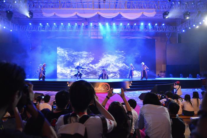 2015年8月28日下午,“剑网3六周年发布会”在珠海长隆国际海洋度假区横琴湾酒店海洋殿宴会厅举行,根据《剑网3》改编创作的粤剧《决战天策府》(下称《决战》)受邀参演,为广大在场ACG玩家演绎全新打造的定制精华版。