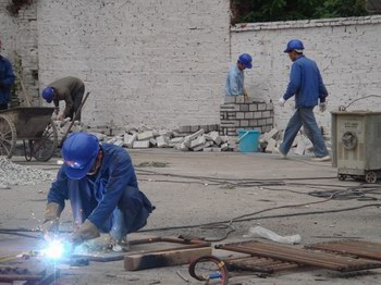 (施工现场紧张有序) (马副厅长,彭主任与我院领导研究、解决工程上的困难。)