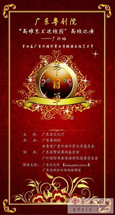 由广东省文化厅主办,广东粤剧院、共青团广东外语外贸大学委员会承办,广东省繁荣粤剧基金会、广外商英学院团委学生会协办的广东粤剧院“高雅艺术进校园”——广外站将于3月25日晚在“广外”云山会堂举行。