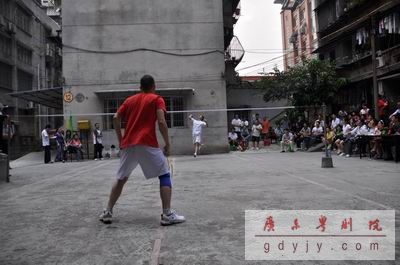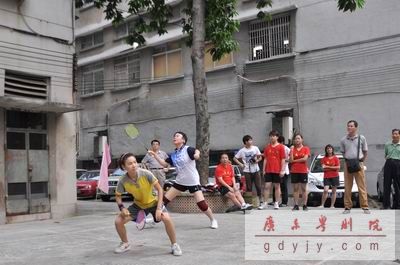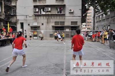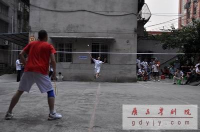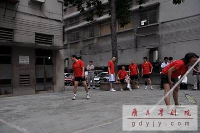 第一场进行的是女单比赛,由祝燕彩(一团)对阵罗绮琪(二团)。罗绮琪在实力上明显占优,前后场的转换十分灵活,大力的扣杀频频得手,毫不逊色于专业运动员。罗绮琪以21:8、21:13两局大比分顺利为二团拿下首捷。