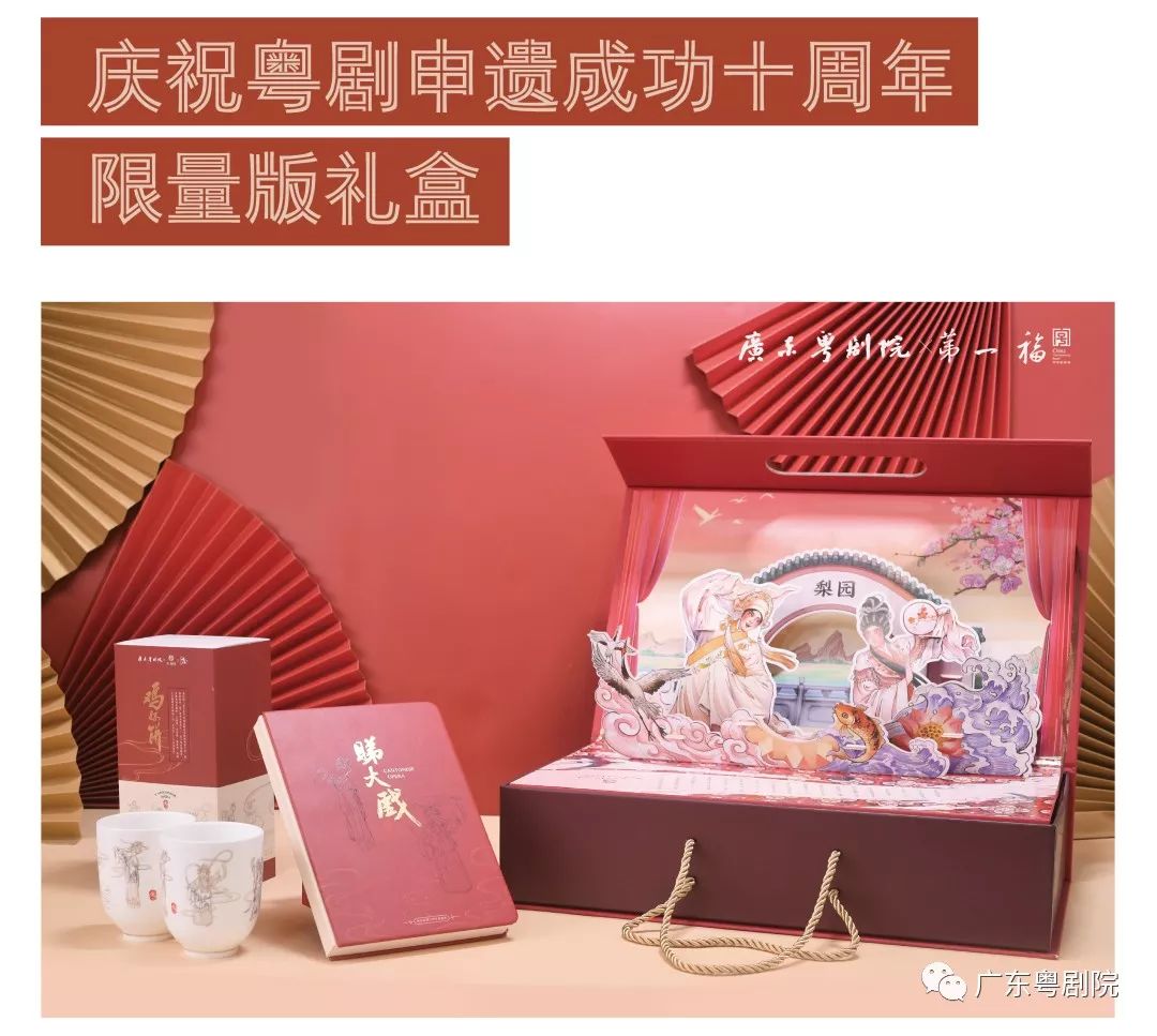 藉粤剧申遗成功十周年的契机,广东粤剧院与第一福达成战略合作,双方发挥各自的优势,强强联合,把粤剧、广彩和广式点心等广府文化有机地融合在一起,以“睇大戏”为开发理念,开发出一系列文创品,让观众在细品复古情怀的同时,还能让观众“把大戏带回家”。