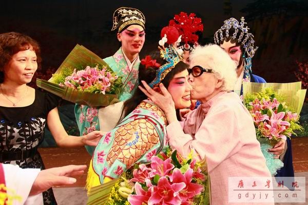演出后,著名粤剧表演艺术家红线女老师上台与演员亲切握手