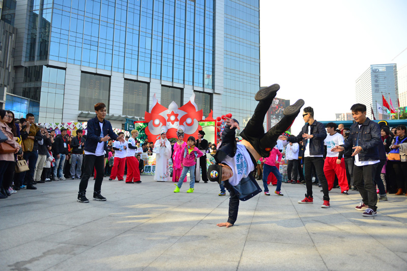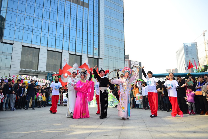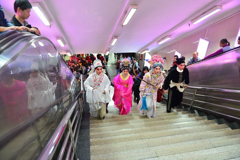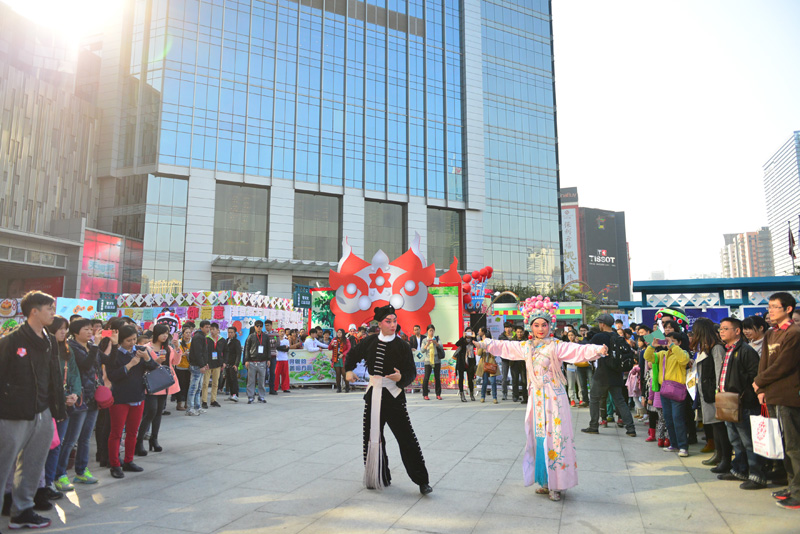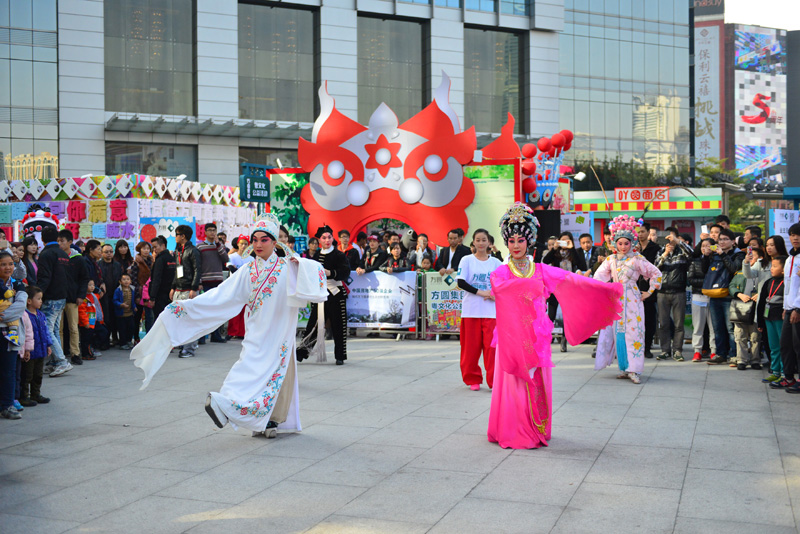 为推广粤文化的传承与创新,12月14日,方圆集团联合广东粤剧院、跨界艺术家卢毅刚在广州东山口地铁站和天河城广场正门举办粤文化大型公益推广活动,举行粤剧街舞跨界快闪活动。让“武松”、“杨八姐”、“柳梦梅”、“牡丹仙子”从古雅的表演殿堂“穿越”到闹市街头与行人互动,大打詠春;穿着戏服的粤剧演员与街舞互动,古今交融,动态地展现粤文化活力,传统与时尚、经典与潮流共冶一炉。