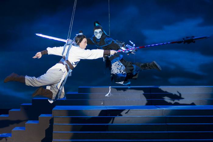剧场中,《剑网3》中“安史之乱”的大时代背景通过一幕幕舞台场景悲壮重现。一开场,两列凶悍的狼牙军从观众席上现身,“雷狼”沙叱博纵身跃上舞台,众多游戏玩家大呼“秒入戏”;李承恩误信奸人,与小七双双堕崖的水底场面,以及李承恩重回稻香村“梦会”小七的情景,“裸眼”3D效果配合“5.1”声道,尽戳观众泪点;水底场面、李承恩与唐傲骨的对打片段,也大胆地采用威也,尽情突破舞台空间。