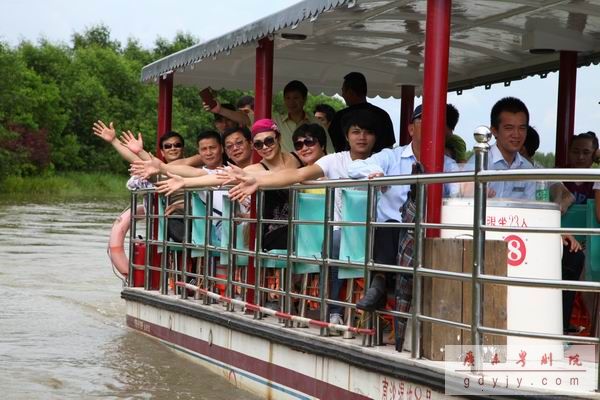 活动第一站是南沙湿地公园,大家乘船在美丽的红树林内游览,美丽的无瓣海桑、芦苇群,为摄影爱好者们提供了好的素材,我们的特邀嘉宾卢海潮潮叔更是唱起了《沙家浜》的唱段,船上欢声不断。游船过后,大家或者骑着自行车在绿树成荫的林荫道中奔驰,或者在电瓶车上观看路边风景,或者三两作伴聊天,“咔嚓”的快门声把这一幕幕的欢乐留作了永恒。