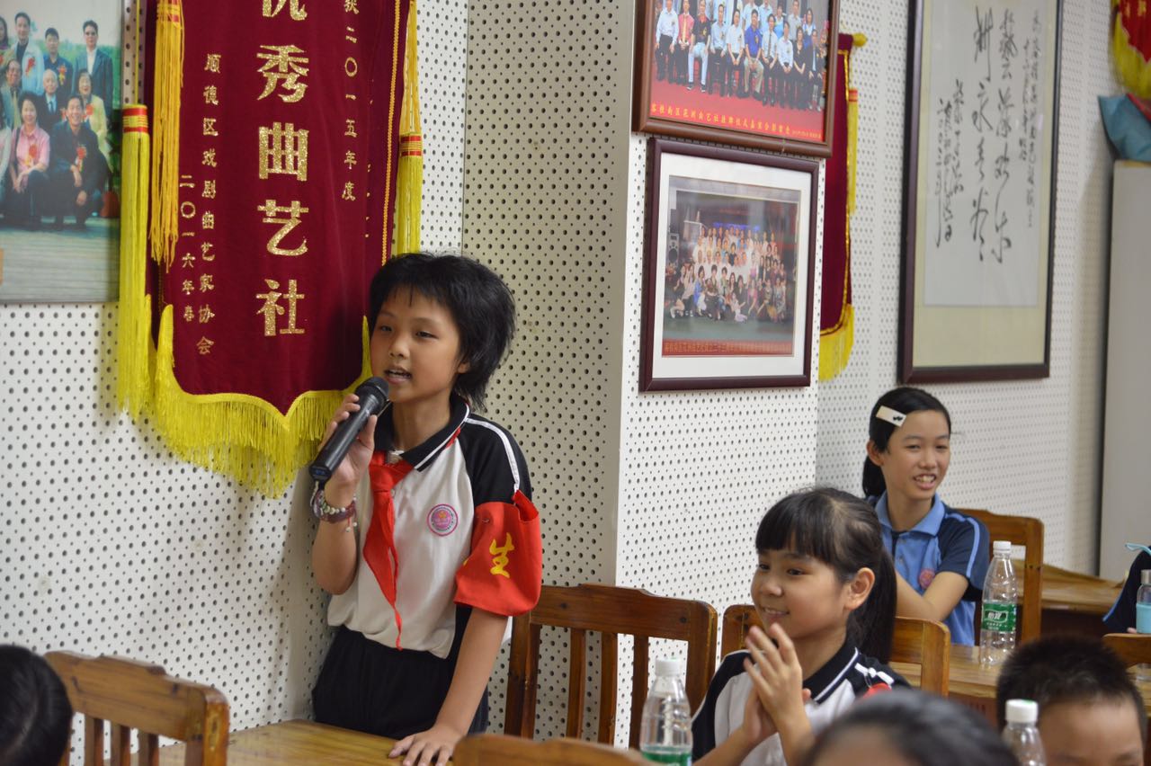 顺德是粤剧之乡,顺德容桂南区小学去年成立了学校的粤剧社团,学校的粤剧氛围也渐渐形成。课堂上,蒋文端风趣地向小朋友们介绍粤剧的基本知识、教小朋友们简单的指法、步法;小朋友也非常踊跃,一位五年级的小朋友还现场展示《荔枝颂》的唱段。
