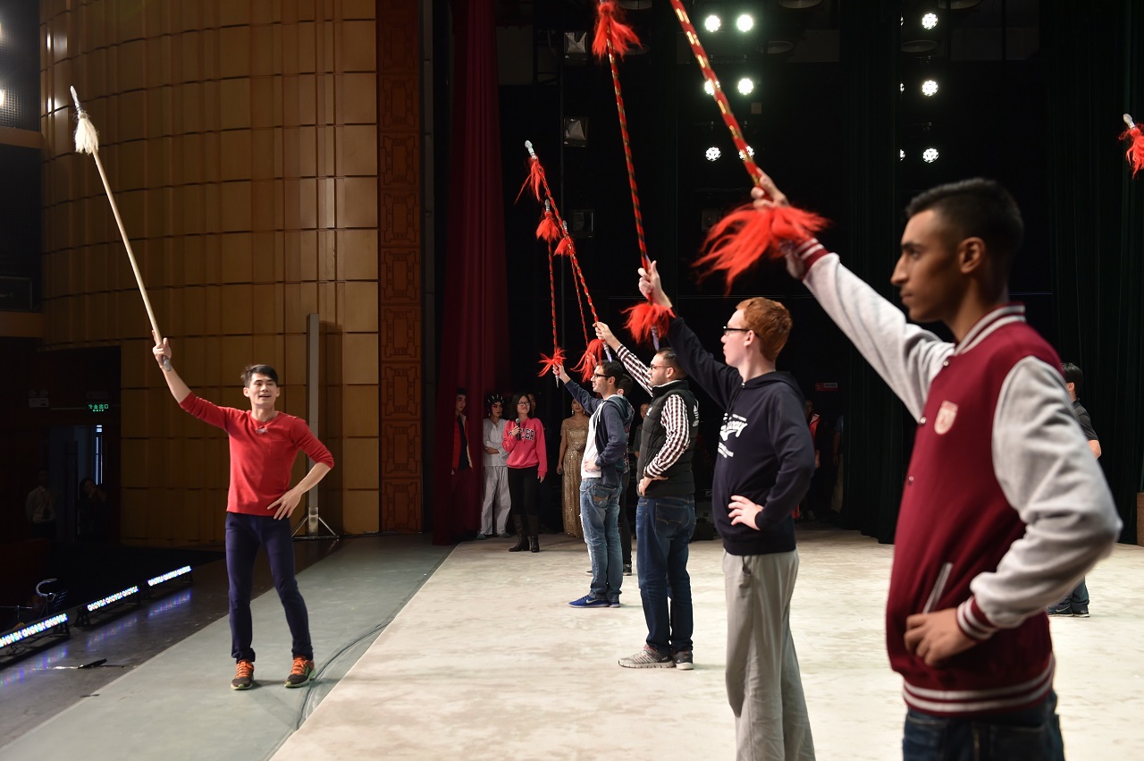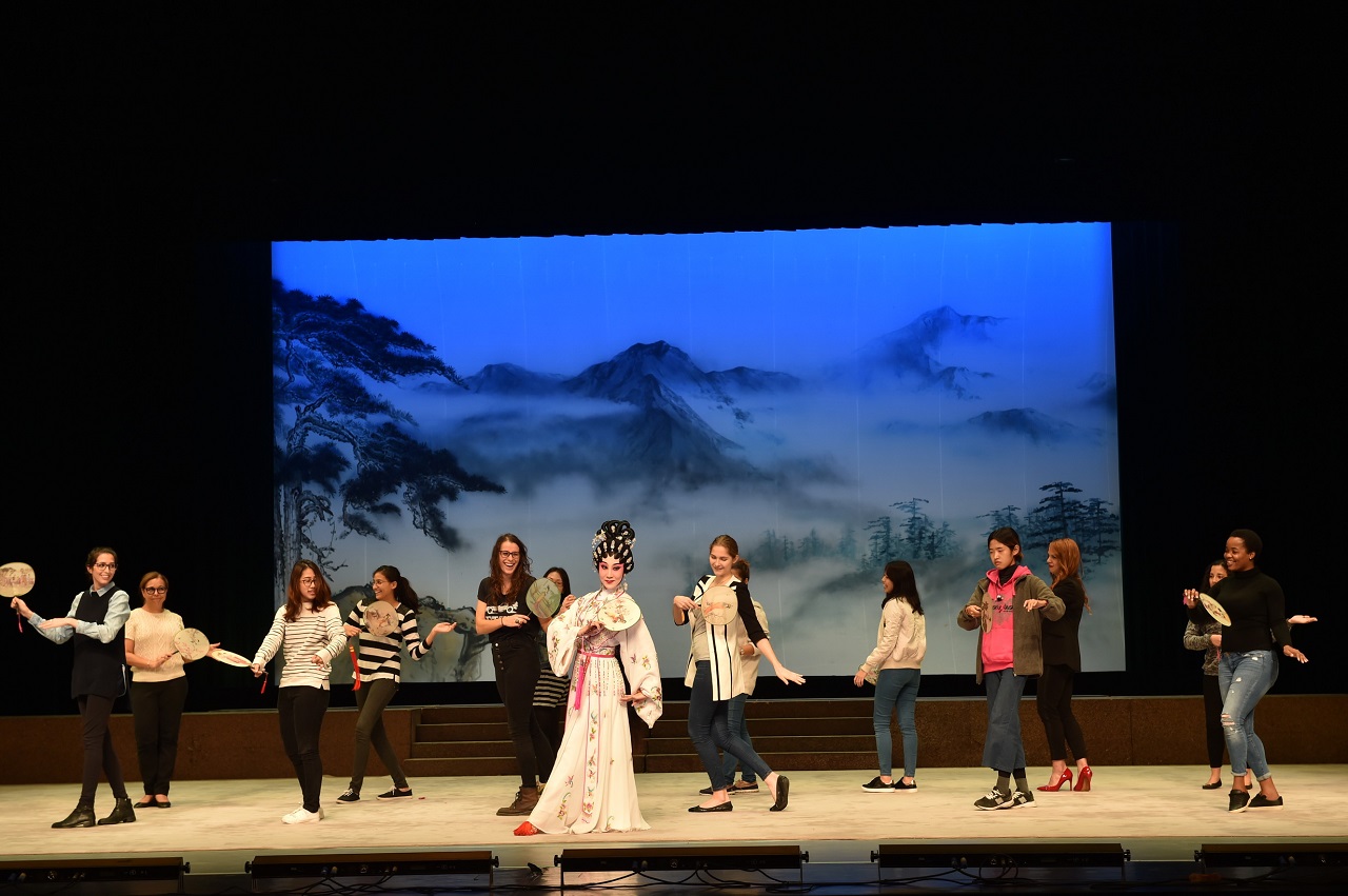 精彩的演出得到全场师生的热烈掌声,在互动环节,广东粤剧院李嘉宜马上履行其职责,与优秀青年演员康健、陈华锦一起教留学生们耍水袖、扇子功和把子功。